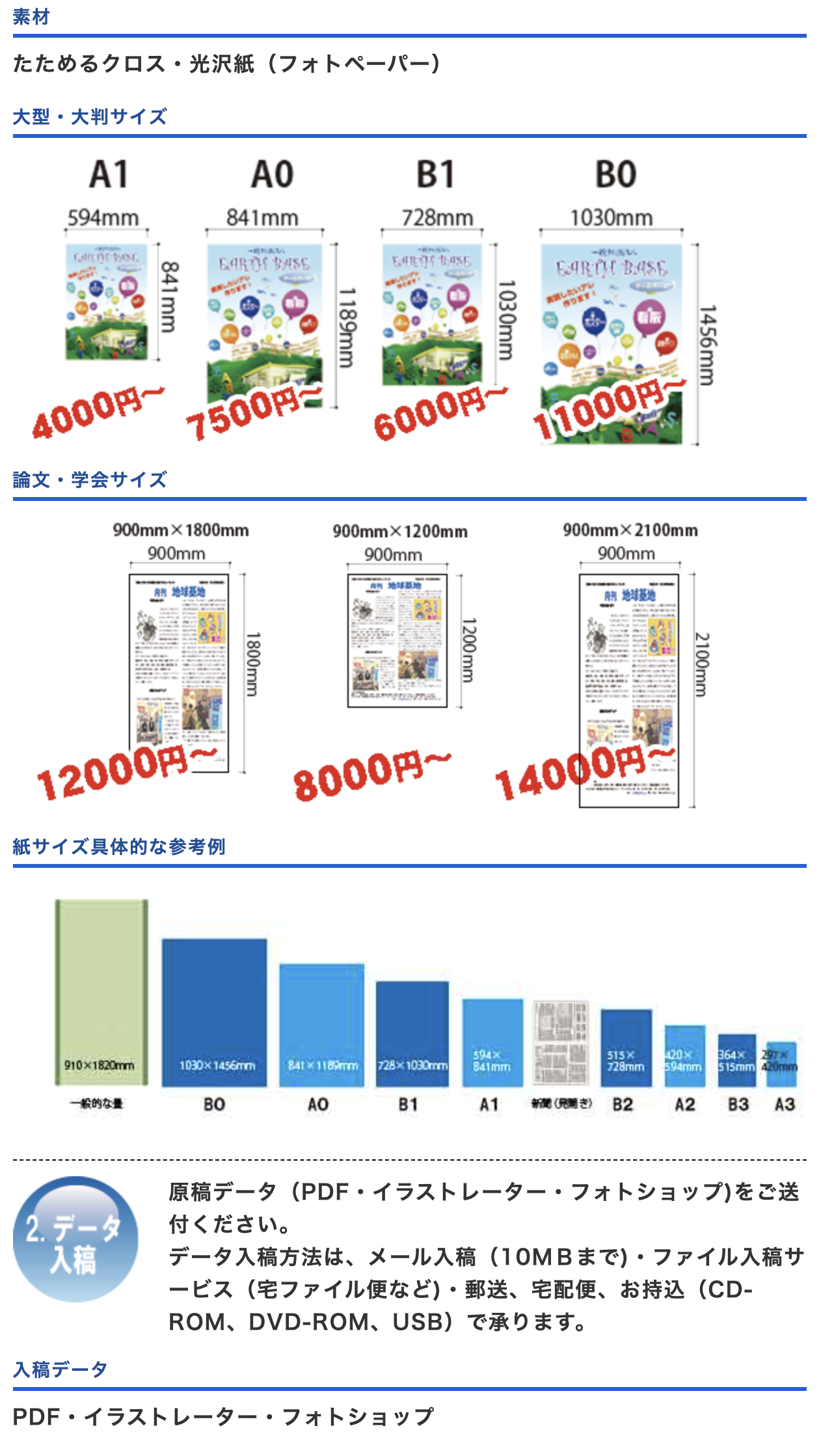 サービス一覧 電話番号 03-5875-5941 Services 看板製作の流れ お問い合わせフォームからご依頼いただいた場合、ご注文が確定してから、一週間程度で納品が完了します。お支払いは、銀行振り込み等受け付けております。主な作業として、データ制作、インクジェット出力、カット作業、施工となります。 データ制作 看板を作る際に、デザイン・レイアウト等のデータ制作をMacコンピュータにより制作します。デザインがすでに出来上がっているのであれば、イラストレーターのデータで、デザイン案を送ってください。イラストレーター以外でデザインを作った場合は、こちらでトレース作業を行い、イラストレーターのデータに変換します。 インクジェット出力 イラストレーターのデータを、大型インクジェットプリンタにて印刷します。メディアは、塩ビタック、光沢紙、ユポ(合成紙)、乳白塩ビ(電飾)、透明塩ビ(電飾)、ターポリン(防炎)、(長期)塩ビタック等、その他品揃え豊富にあります。 カット作業 インクジェットプリンタで印刷されたメディアをカッティングプロッターや手作業でカットします。手作業なので、様々な形にカットすることが可能です。 施工 出来上がった看板を、職人が取り付けに行きます。 屋内パネル 屋内用のメディアにラミネートをかけるなどします。室内表示板や、ピクトサイン等様々な形式のものを受け付けています。 自立看板 このような形の自立看板が欲しい等、ご要望をいただければそれに近い物をこちらで提案させていただきます。 ガラス装飾シート お客様控え室がガラスで覆われていて、見えないように装飾して欲しい等、ご要望にお応えします。 壁面看板 屋外用のメディアに、ラミネートをかけるなどします。耐久性に優れ、3〜5年程度もちます。 電飾看板 電飾用のメディアを使います。光を通します。 エレベーターサイン エレベーターサインのような、細かいものや小さなものでも対応しています。気軽にお問い合わせください。 サポートサイン 電話番号 03-5875-5941 全国対応しています。 日本全国サポート対応しています。お問い合わせいただきましたら、近くの事業所が担当いたします。お気軽にお問い合わせください。 お問い合わせはコチラ 大型・大判ポスター論文ポスタープリント 電話番号 03-5875-5941 ご注文 お問い合わせフォームまたはお電話にてご注文ください。ポスターの素材・サイズをお選びください。 お問い合わせはコチラ